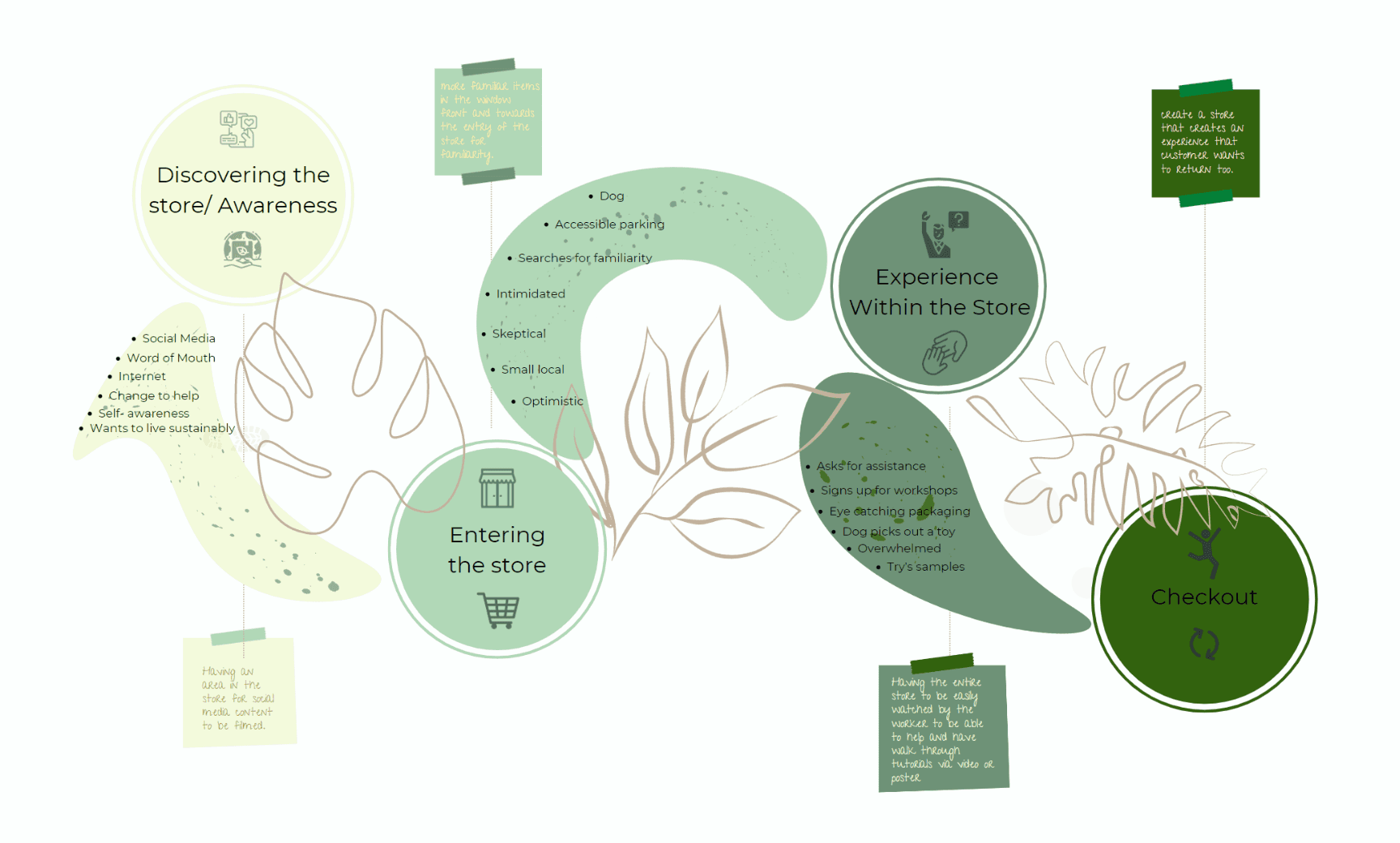The store's design promotes a sense of untraceability, allowing customers to see beyond their immediate surroundings with open shelving, enhancing their experience at each unique pod before interacting with the kiosk. The material choices prioritize sustainability, with plywood used for built-in shelving due to its renewable and recyclable nature. The refillery wall features cork, a highly sustainable and biodegradable material that absorbs spills. Glass bottles are selected for refillery items because they are endlessly recyclable. The store retains its original exposed wooden beams and stained concrete flooring, preserving the building's natural character.