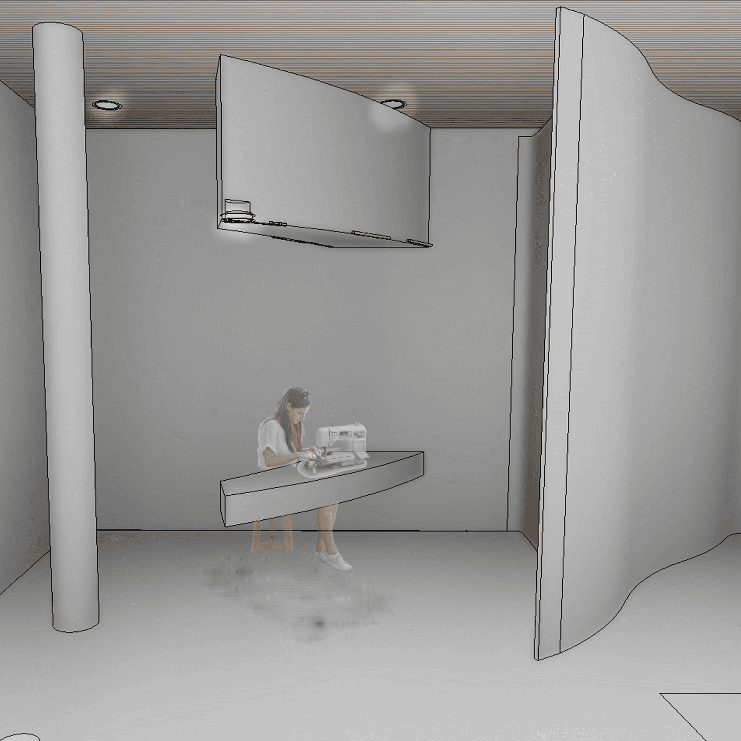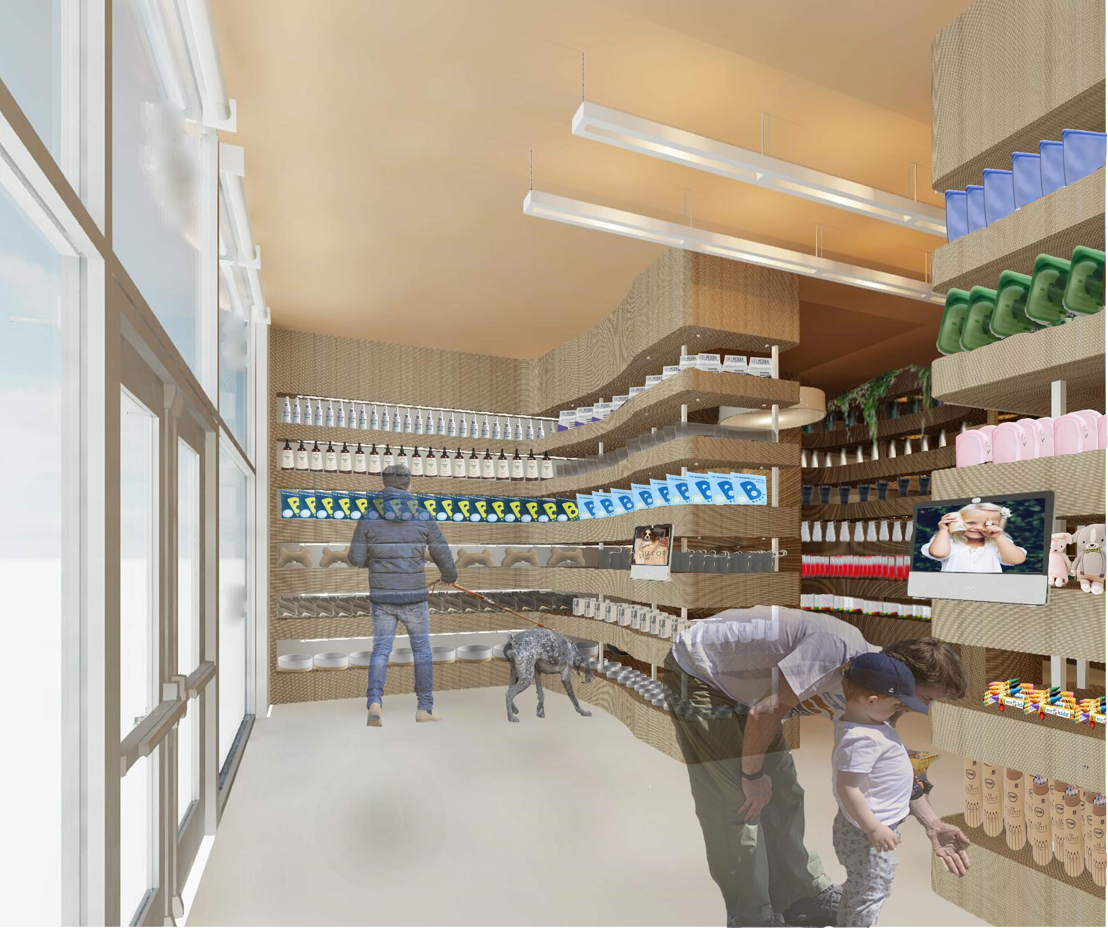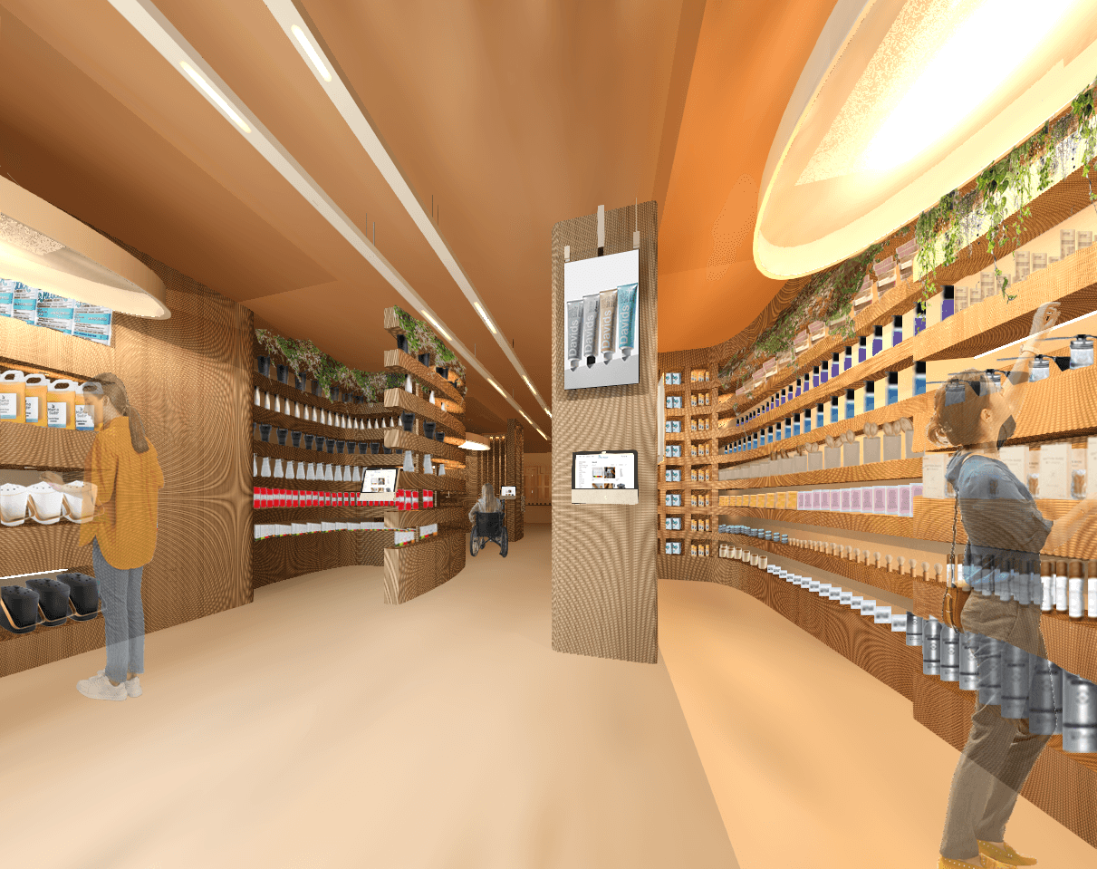 The concept for this project is Traceless. Traces are everywhere and left by everything. We leave traces everywhere, everyday in different ways. Products we use are made then erased and remade and the whole cycle is on repeat. We talk about wanting to leave the least amount of a carbon footprint into the world , if we individually we make a change, big or small, it will help in the long run. The whole store is designed for the user to feel untraceable resulting in a traceless design. Anywhere you stand in the store, it allows you to see beyond what you are looking at due to the open shelving. This design creates an experience for the user at each different pod. Before moving onto the next the user will plug in items to the Kiosk.