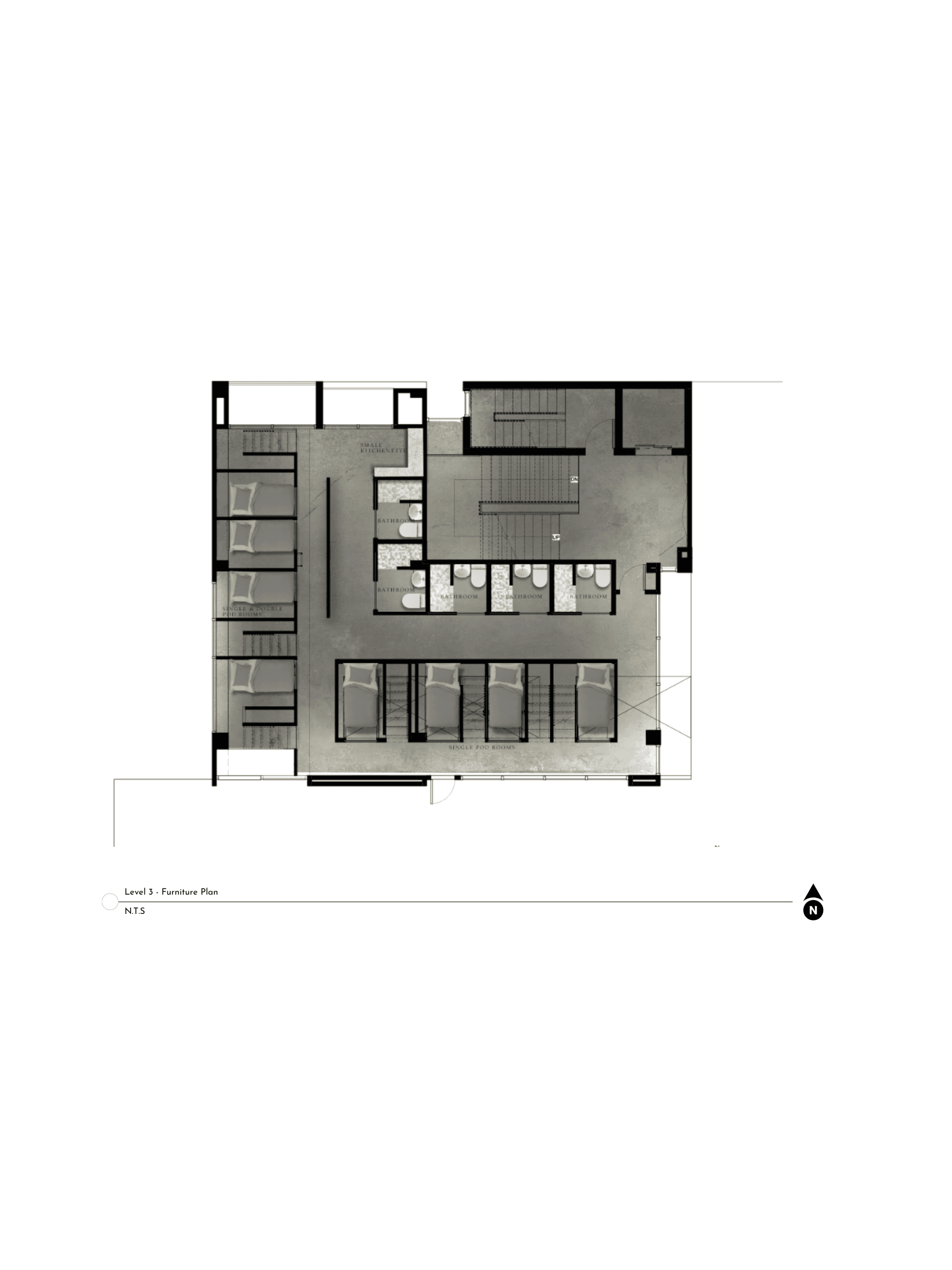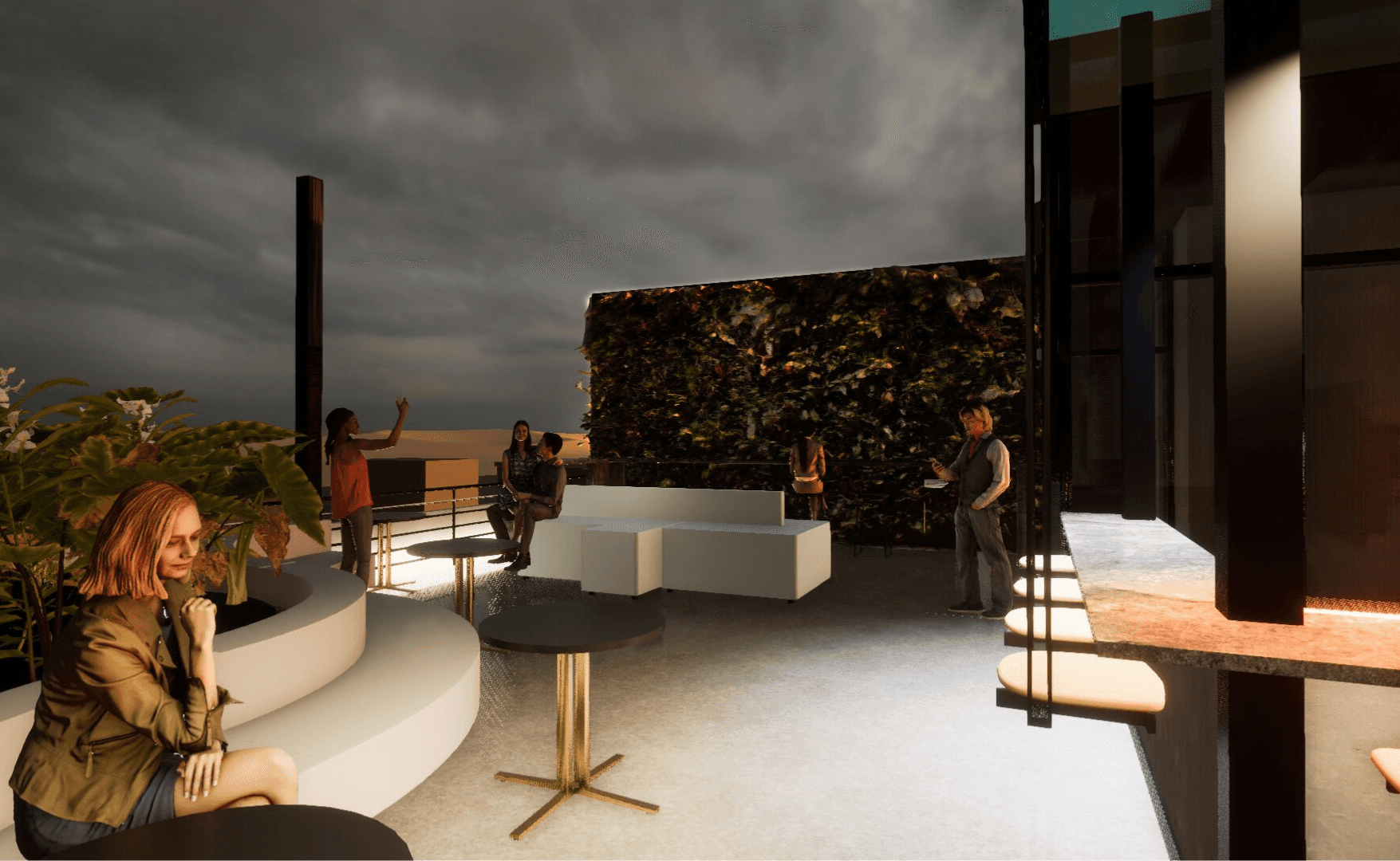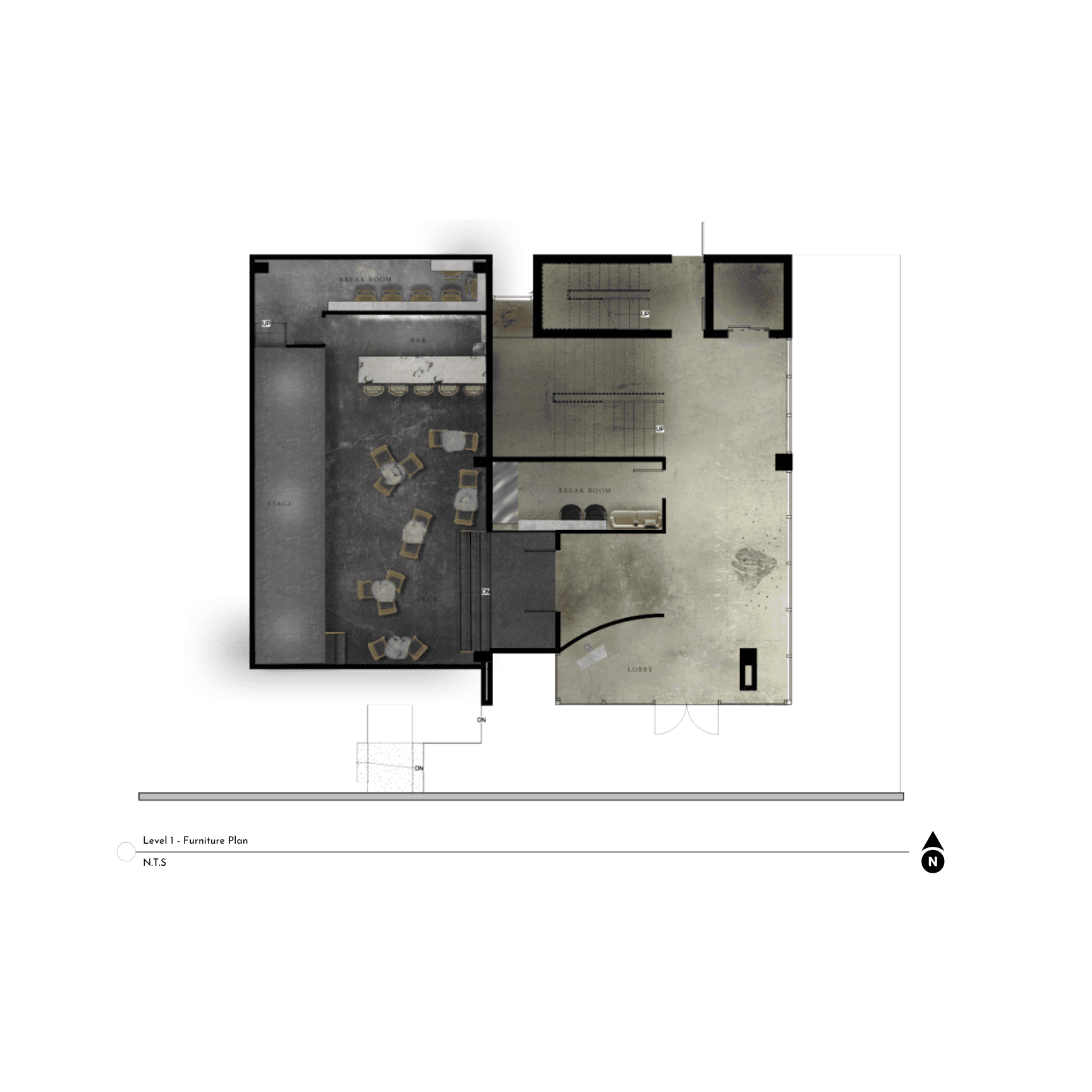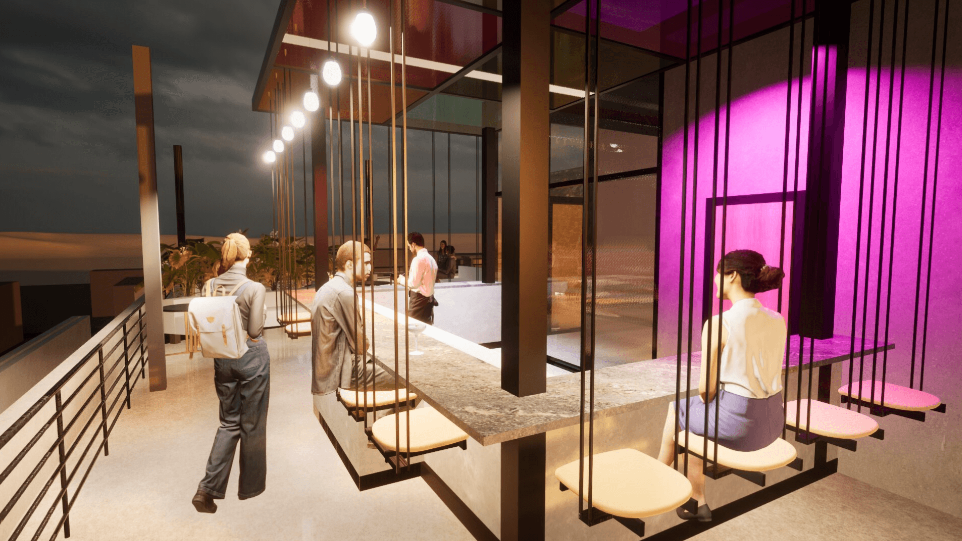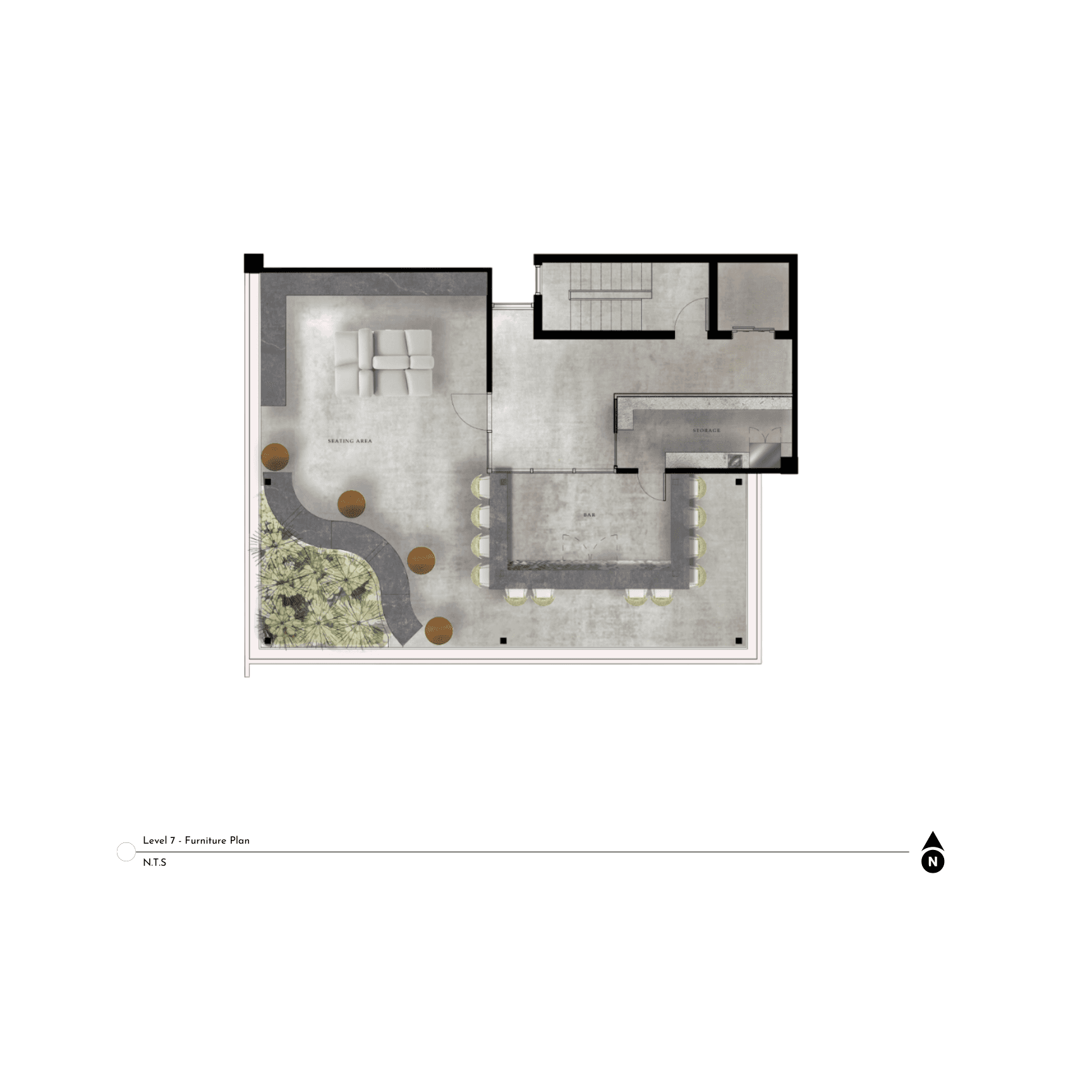 Throughout the project you will see the most extreme concept development through the downstair burlesque bar portraying the idea of 'being grounded' this is shown by using strong, rough materials, dark colors, and built in furniture. On the opposite side of the spectrum is the rooftop bar, this is meant to give the idea of 'weightlessness' and is shown through organic, glowing shapes, swinging furniture, and water features.