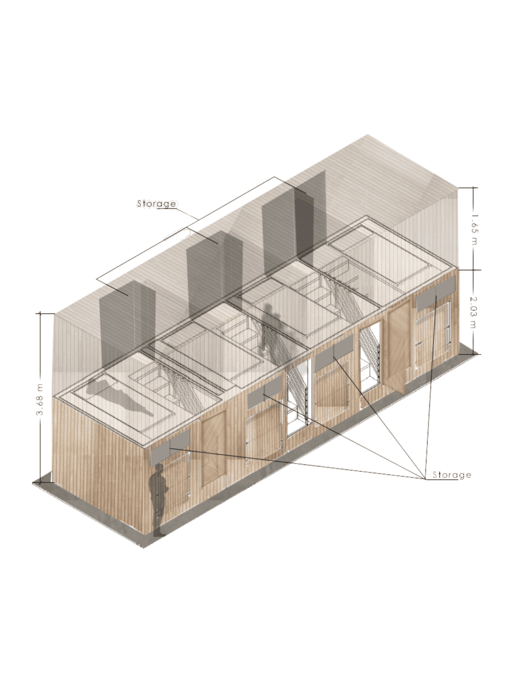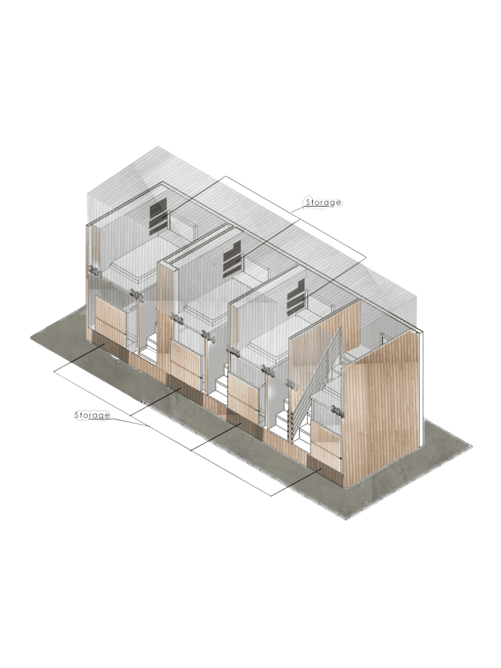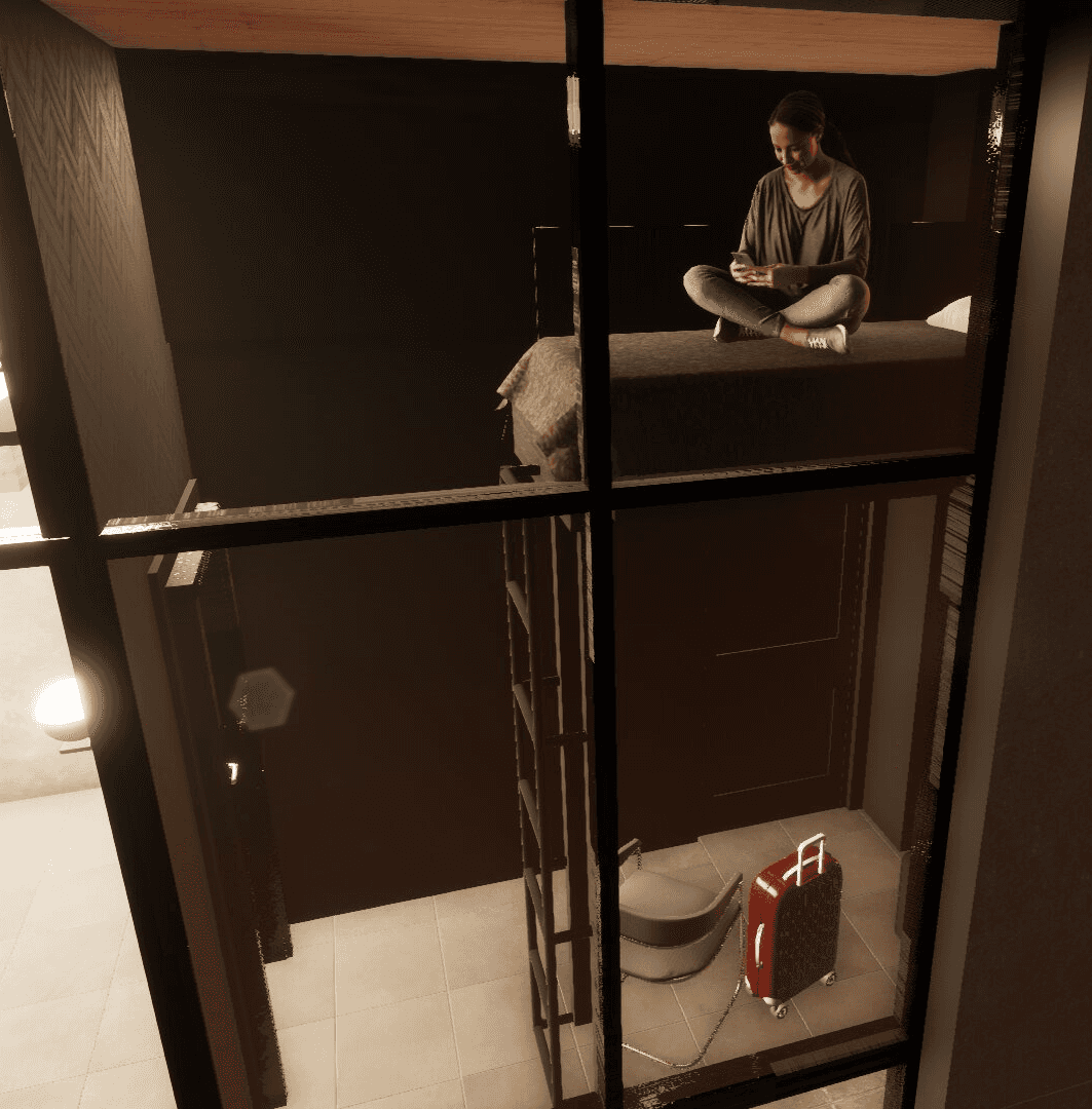 The pods were designed to ensure maximum privacy for each individual. This is accomplished through a private door for access to the upper level, and a 'garage' door to enclose the lower level. The user must scan their key through the app. The upper and lower level pods have individual storage built in. The upper pods have built in shelving along the left and backside for
