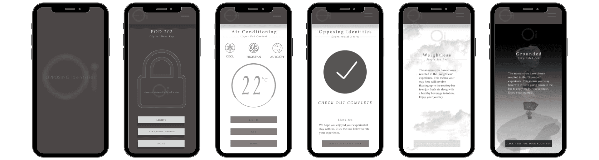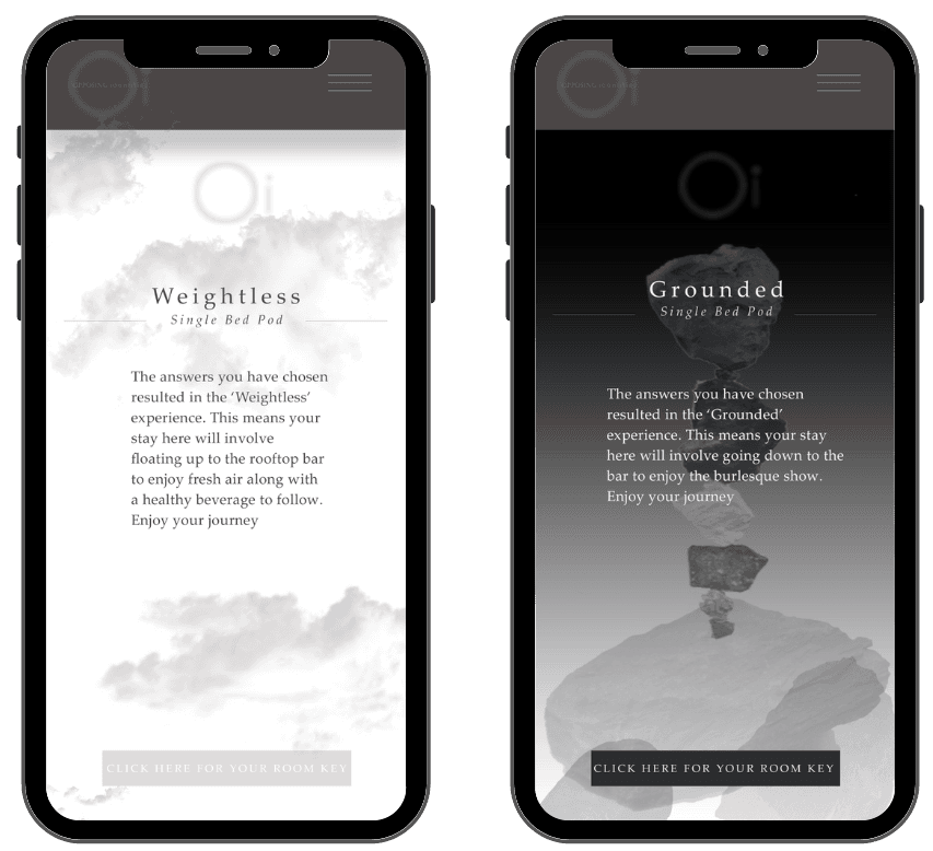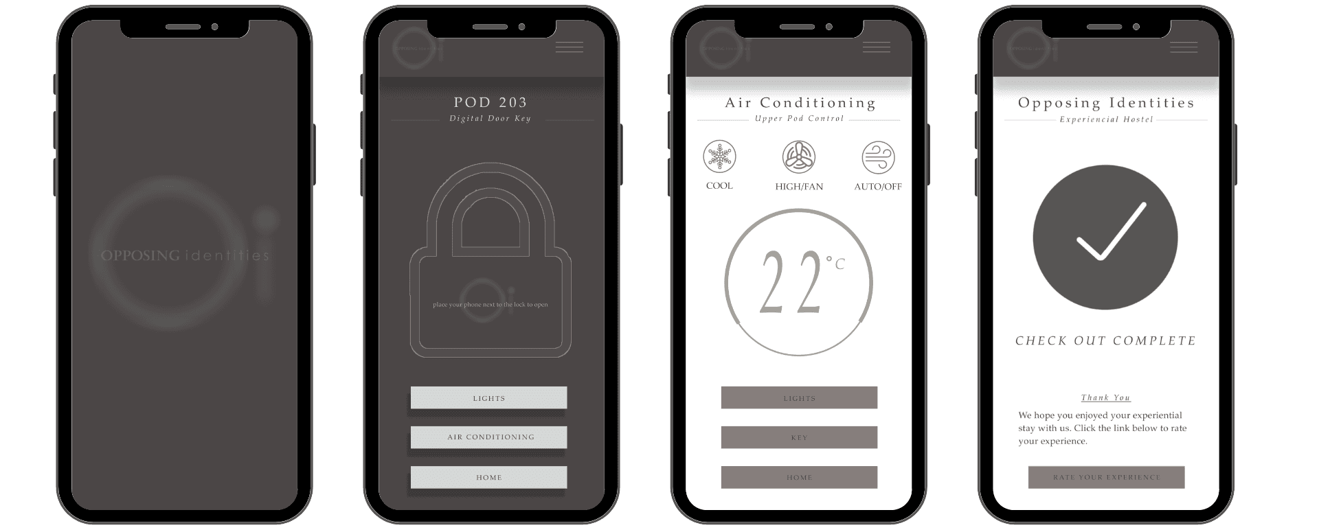 As an experiential hostel, guests download the OI app upon arrival and take a test to determine their assigned experience based on the results. The app then allows users to control amenities within their pod or room and